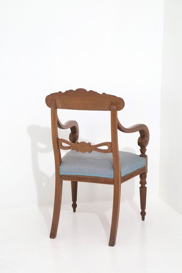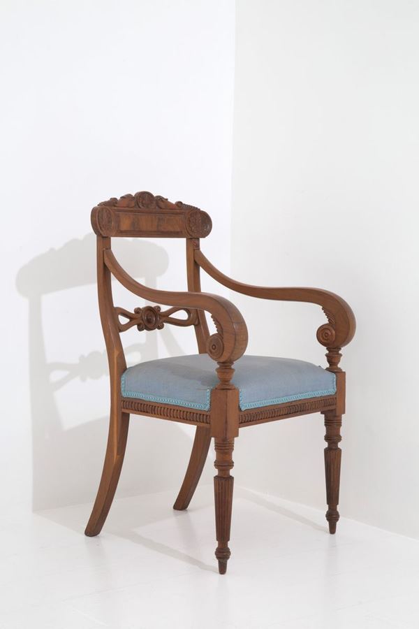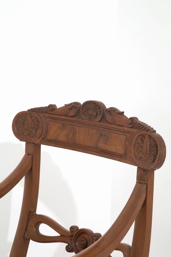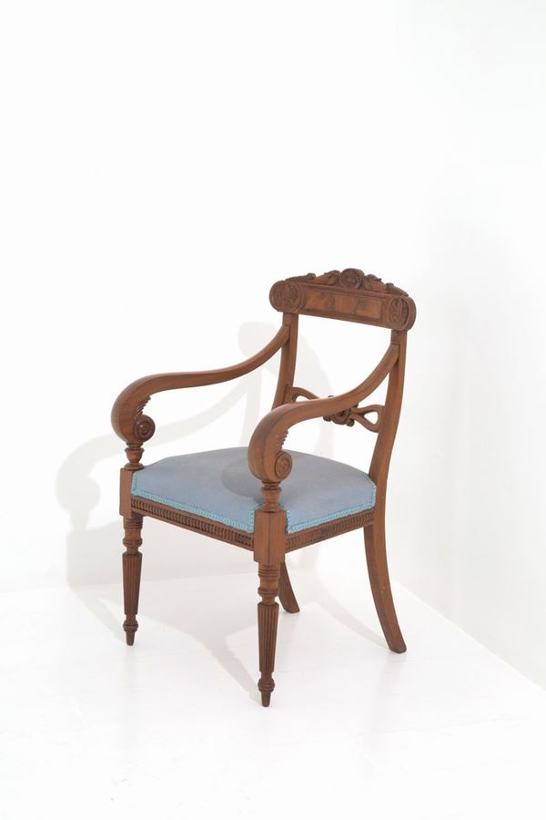 Four armchairs in mahogany wood finely carved with floral and animal motifs with seats upholstered in blue cotton. PETERS workshop. Genoa. Nineteenth century.