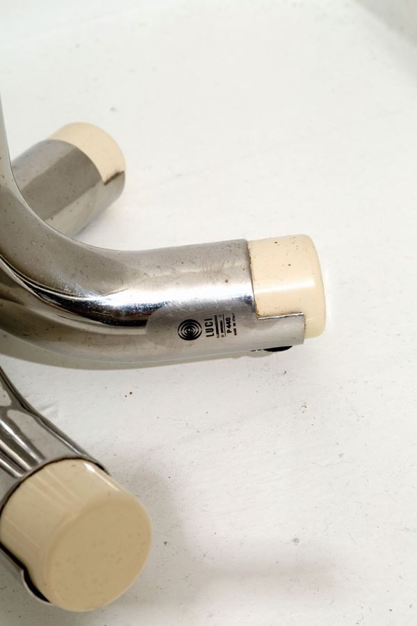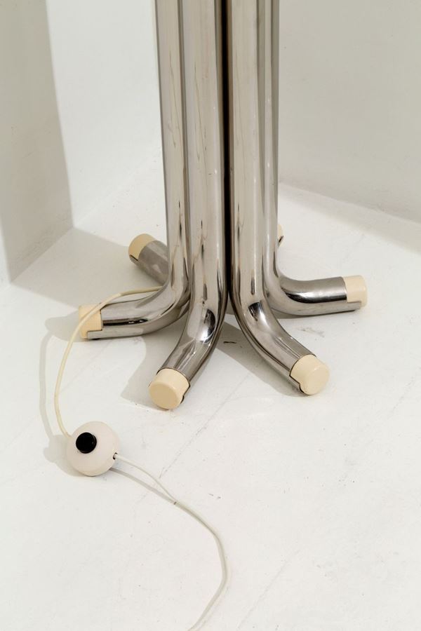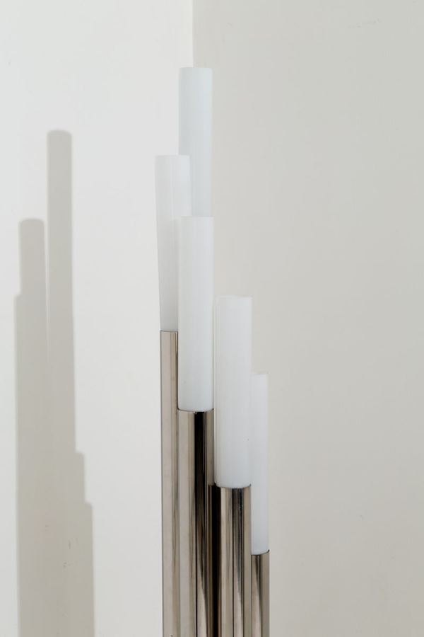 Six lights floor lamp in chromed steel, glass and plastic feet. Marked LUCI MILANO on one foot. 1950s.