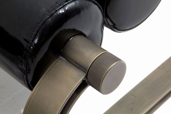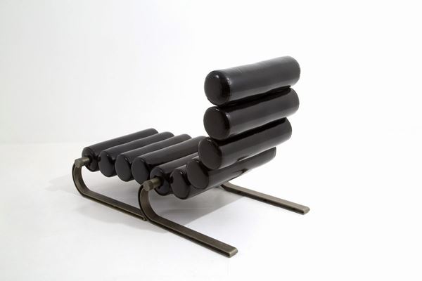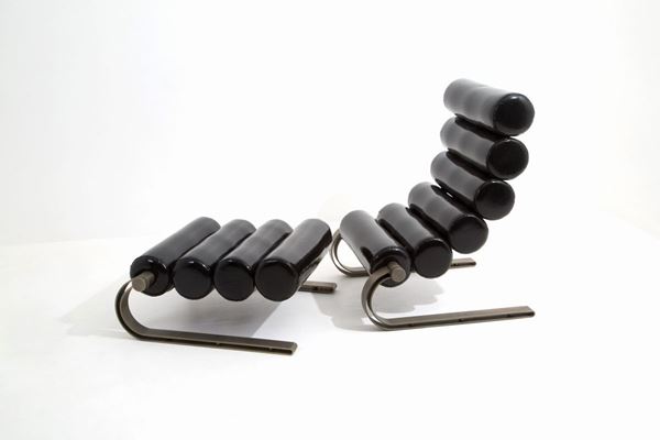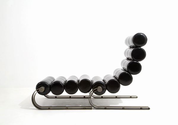 Hanging armchair with footrest in glossy black vinyl and nickel-plated steel. Signed on the support. 1970s.