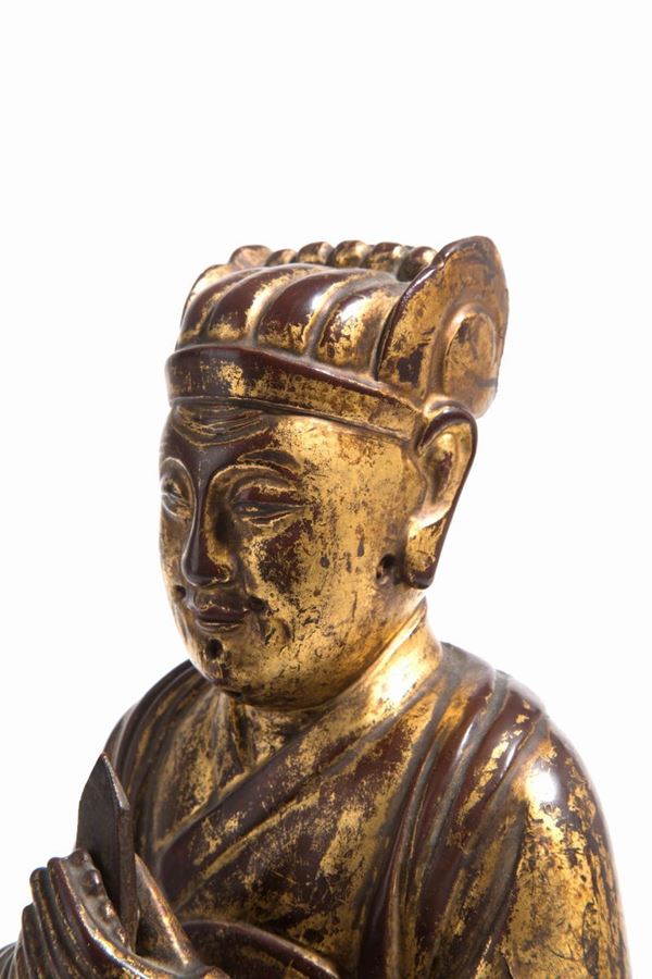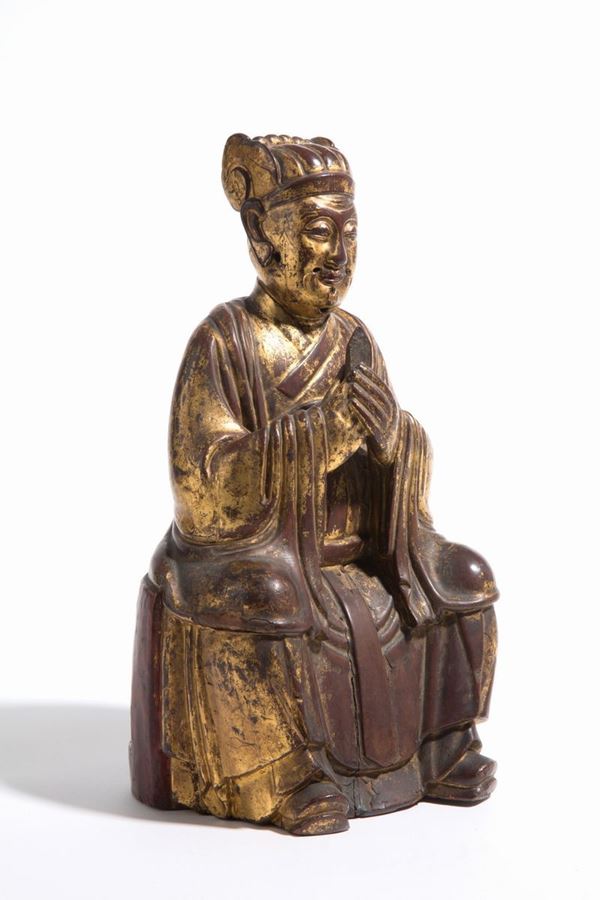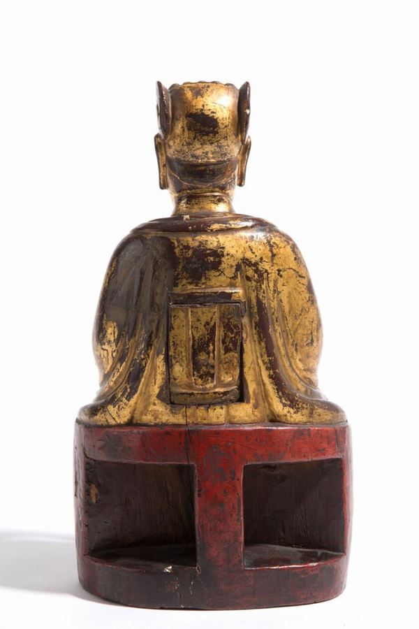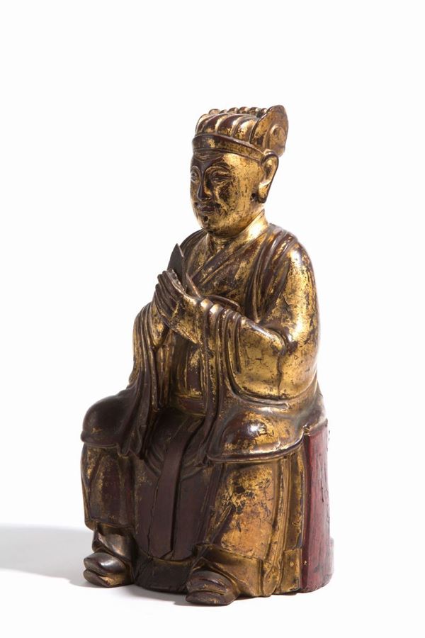Sculpture in gilded and lacquered wood depicting "HOLY MAN SITTING". China.