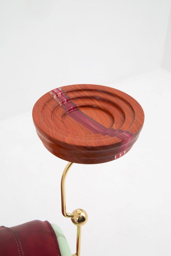 Reception stool to place the goblet, model Horsett, in painted tubular with red leather seat , brass stand and cup holder in padouk wood with plexiglass inserts. Production BEDDING BREVETTI SNC. 1974. With label and certificate by the manufacturer dated October 17, 2019 . Unique copy.