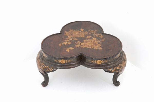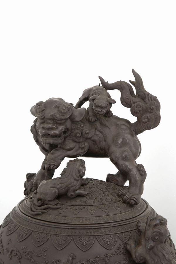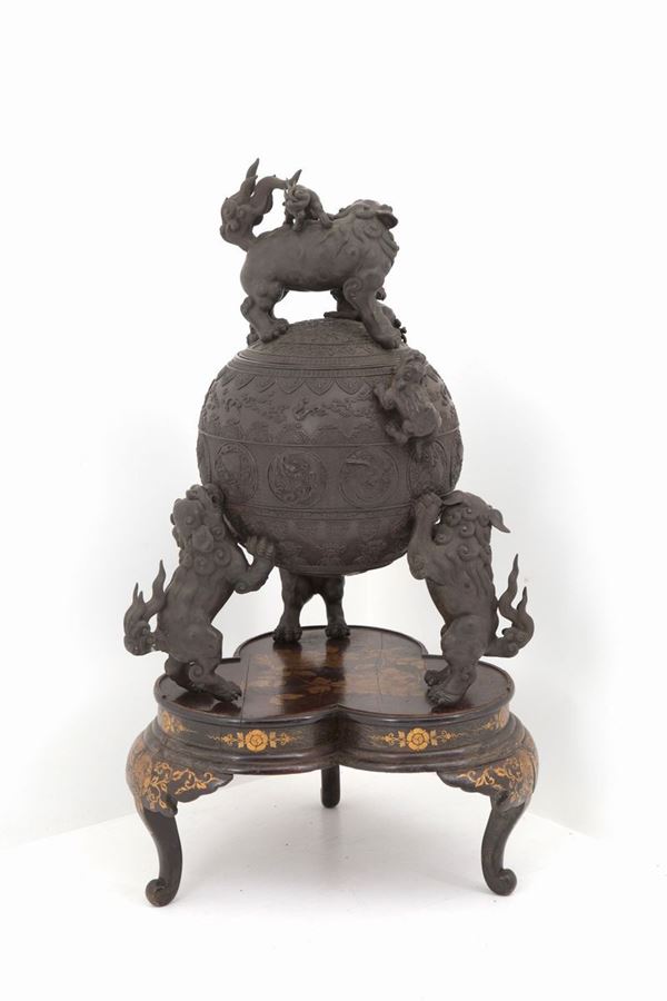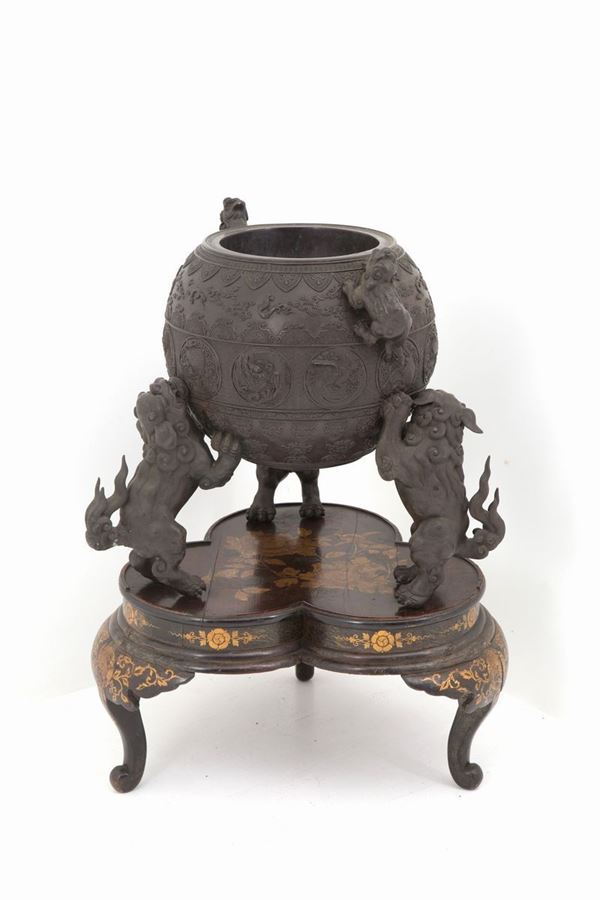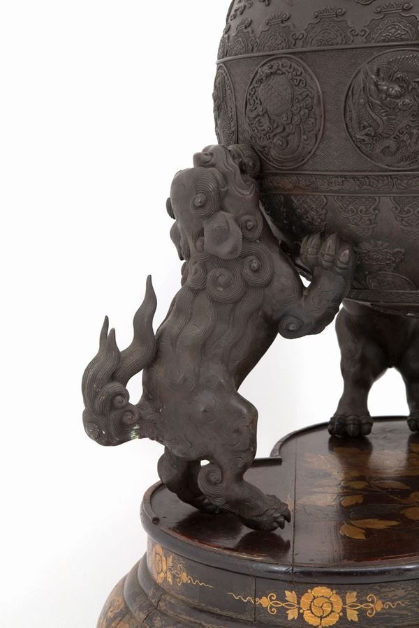 Imposing incense burner in chiseled bronze supported by Cani di Fo. Base in lacquered and gilded wood. Japan. Meiji period.