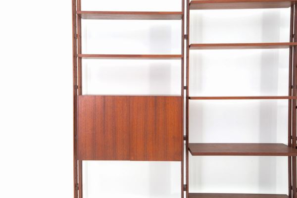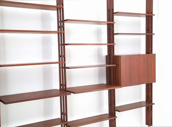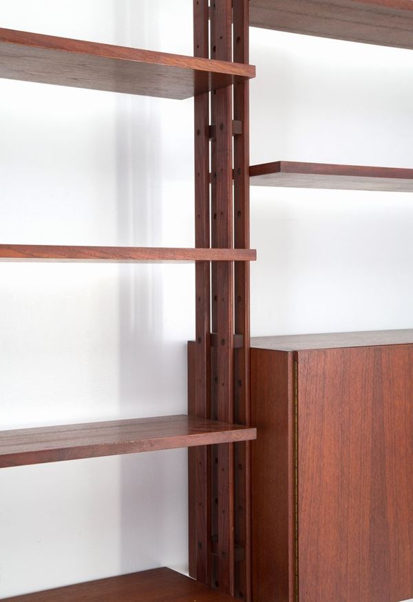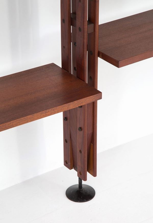 LB7 ceiling bookcase in wood with five uprights. Production POGGI PAVIA.1950s. Published in Domus n. 334 (September 1957), advertising; Centrokappa, The Italian design of the 1950s, Ricerche Design Editrice, Milan, 1985, p. 113; I. de Guttry, M. P. Maino, The Italian furniture of the 40s and 50s, Laterza, Bari, 1992, p. 77; G. Gramigna, 1950-2000 Repertoire, Allemandi, Turin, 2003, p. 53 and G. Bosoni, Federico Bucci, Franco Albini's design and interiors, Electa, Milan, 2009, p. 101.