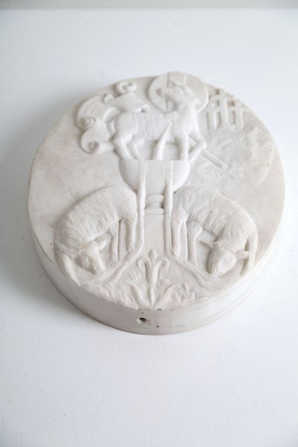 Medallion in white Carrara marble carved depicting "AGNUS DEI''. 17th century.