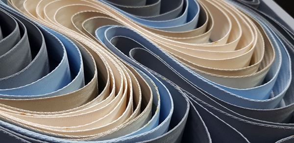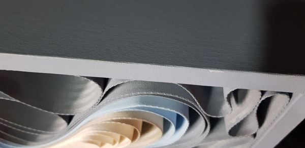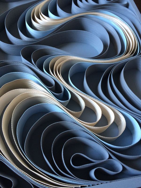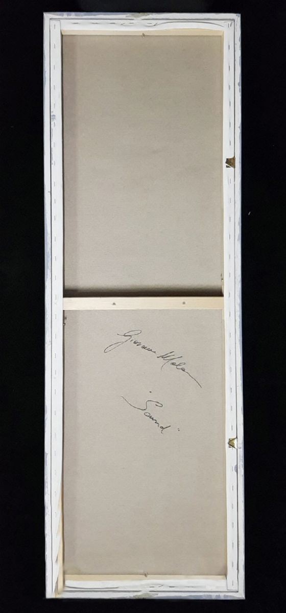 Mixed technique on canvas with painted ribbons entitled "RHYTHM". Signed on the back. Three-dimensional effect.