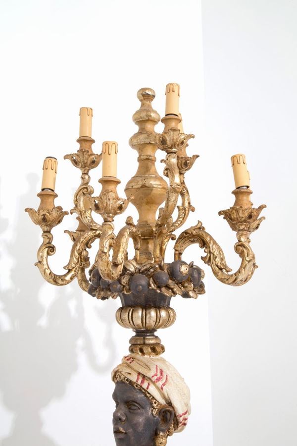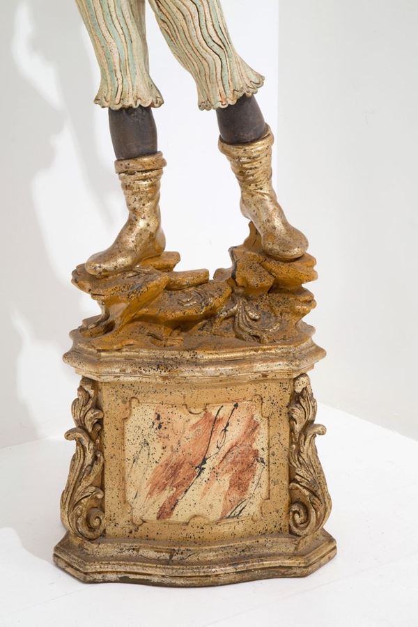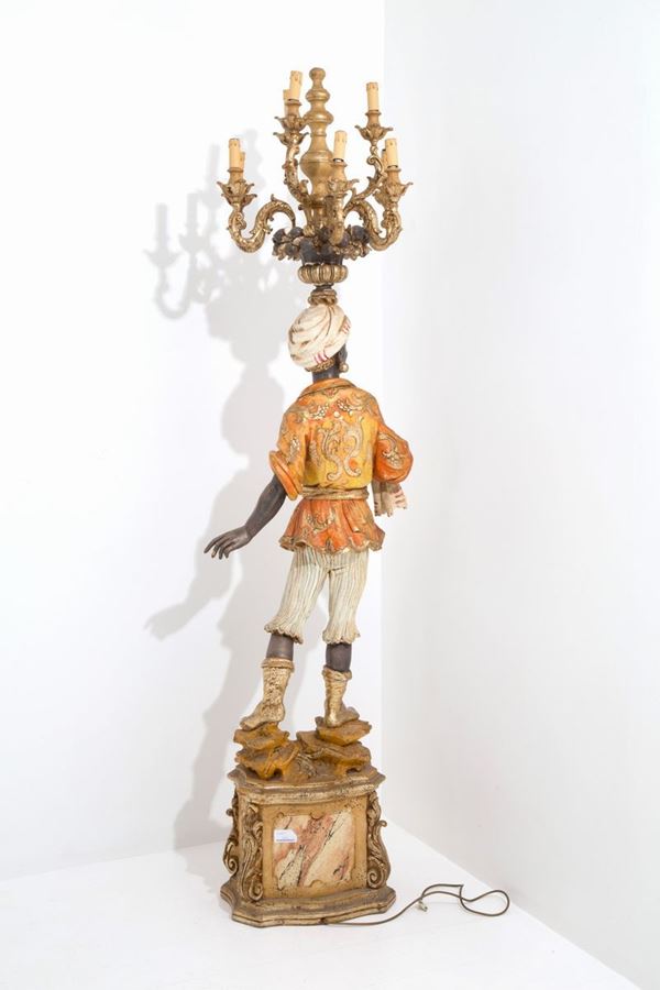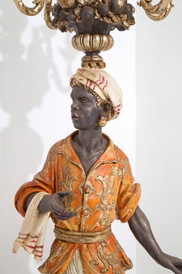 Finely carved and lacquered wooden sculpture depicting "MORETTO WITH CANDLES". 20th century.