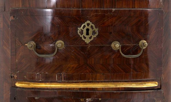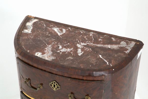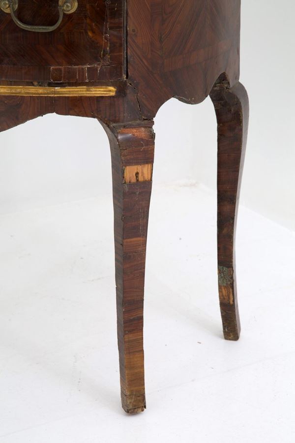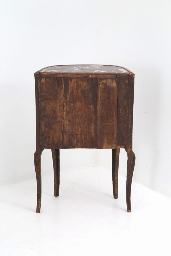 Bedside table veneered in precious woods with marble top and gilt bronze trimmings. Sicily. XVIII century. Defects and shortcomings.