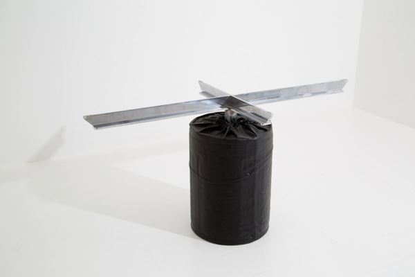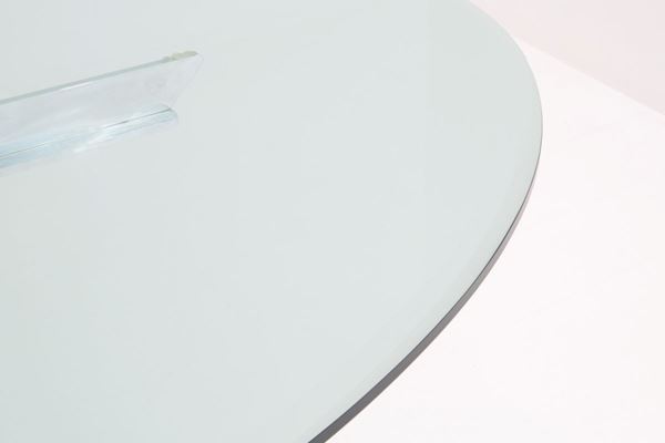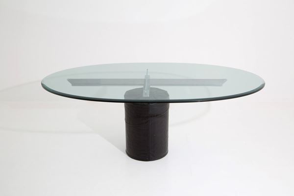 Oval table with steel and concrete base covered in black leather and ground glass top. 70's.