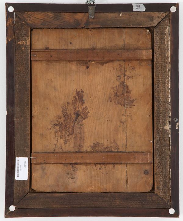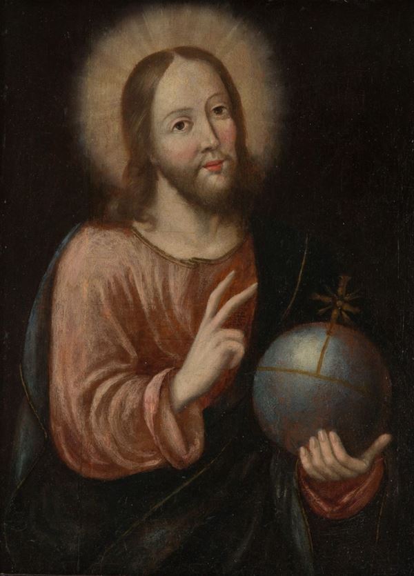 Oil painting on panel depicting "BLESSING CHRIST". Late 16th-early 17th century. In guilloché frame.