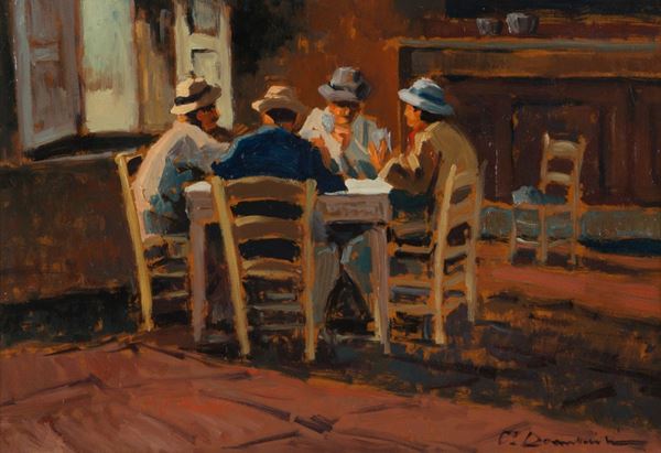 Oil painting on plywood depicting "CARD PLAYERS". Signed lower right. In frame.