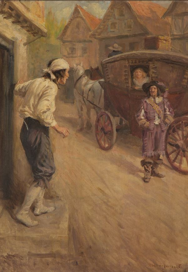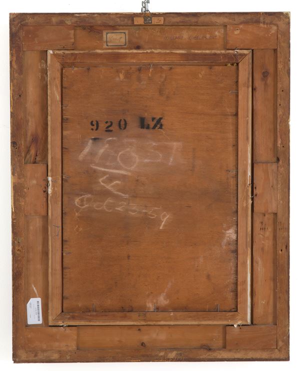 Oil painting on cardboard depicting "CARRIAGE WITH CHARACTERS IN THE COUNTRY". Signed lower right. In frame.