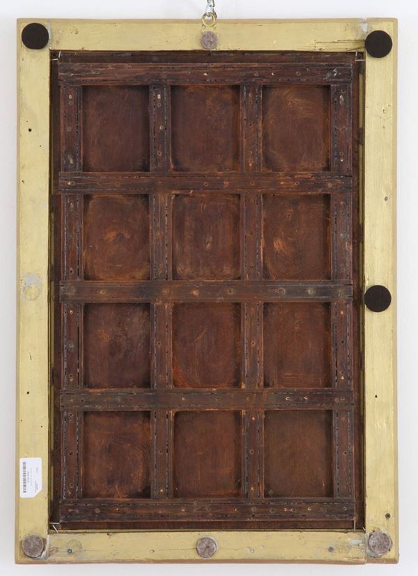 Oil painting on wood depicting "CHARACTERS COMING DOWN FROM THE MOUNTAINS". Unidentified signature lower left. In frame.