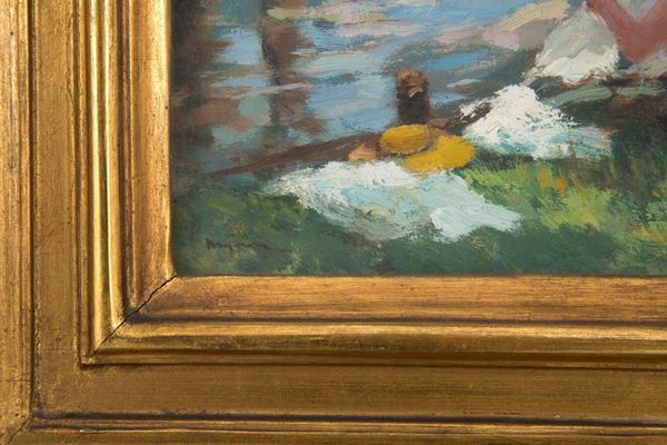 Oil painting on tablet depicting "LAUNDRY AT THE RIVER". Signed lower left. In frame.