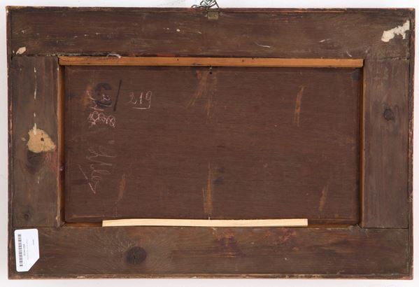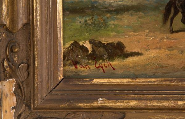 Oil painting on tablet depicting "SHEPHERDS". Signed Van Eyck lower left. In damaged frame.