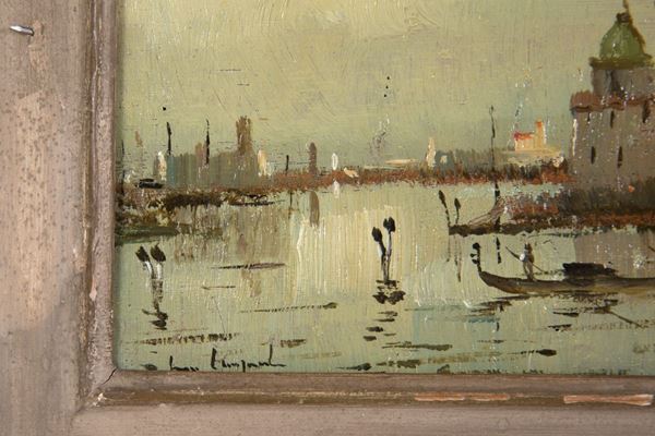 Oil painting on tablet depicting "VENICE". Unidentified signature lower left. Early 20th century. In frame.