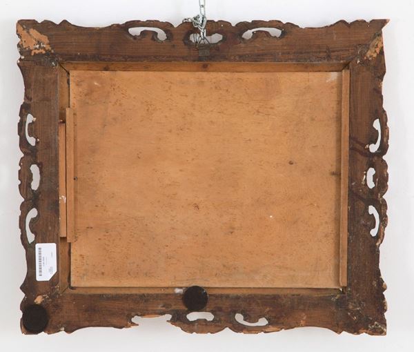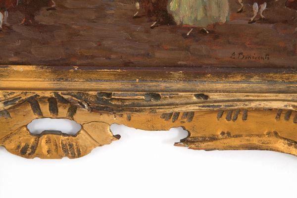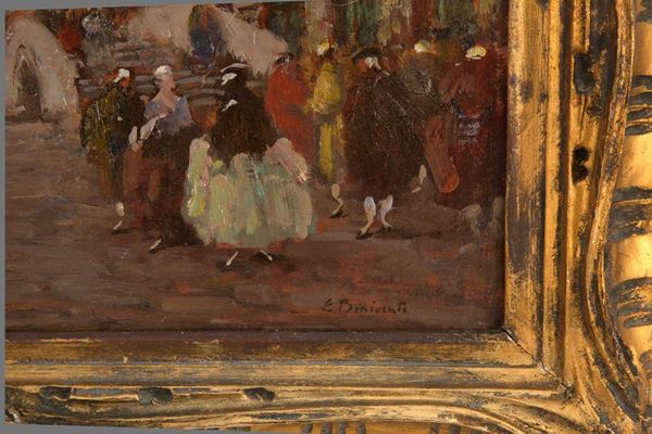 Oil painting on plywood depicting "VIEW OF SAN MARCO WITH CHARACTERS". In carved and gilded frame with lacks.