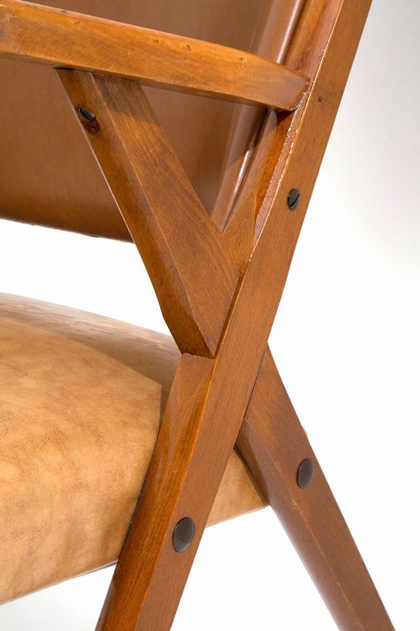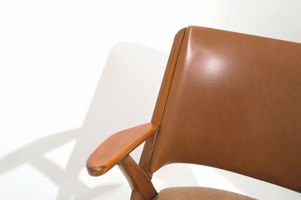 Pair of armchairs in wood and leather. Production FROM REAL, Conegliano Veneto. 1950s. With authenticity stamp.Good condition, signs of wear dictated by time. Inspired by the Nordic design of the CH28 chair by Hans Wegner & Carl Hansen.