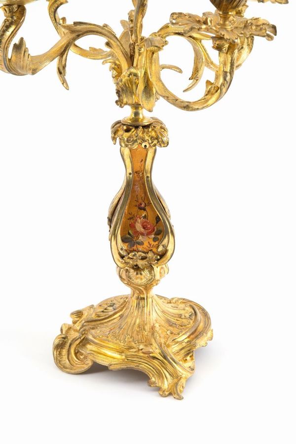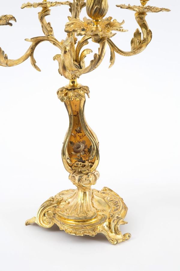 Pair of five-flame candelabra in chiseled and gilded bronze depicting "FLORAL SUBJECTS" on the stem. Nineteenth century.