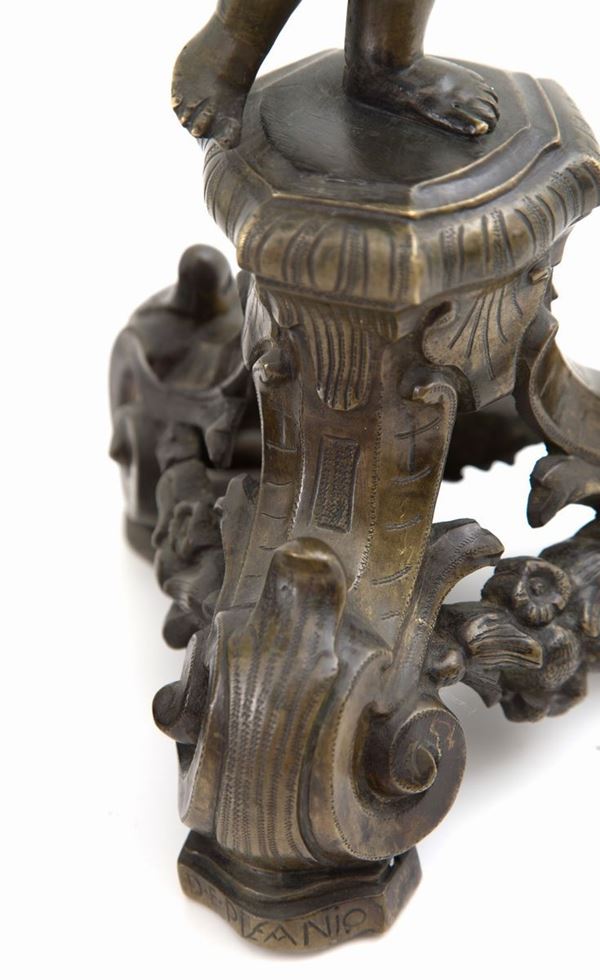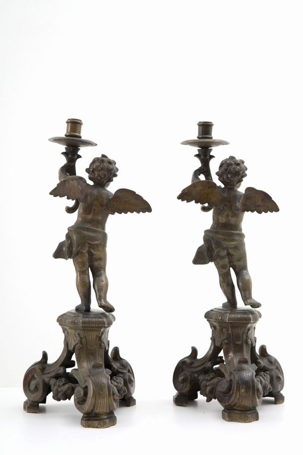 Pair of finely chiselled lost wax bronze candlesticks depicting "ANGELS WITH CORNUCOPIES". Northern Italy. XVIII century.
