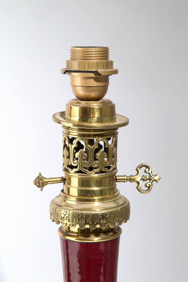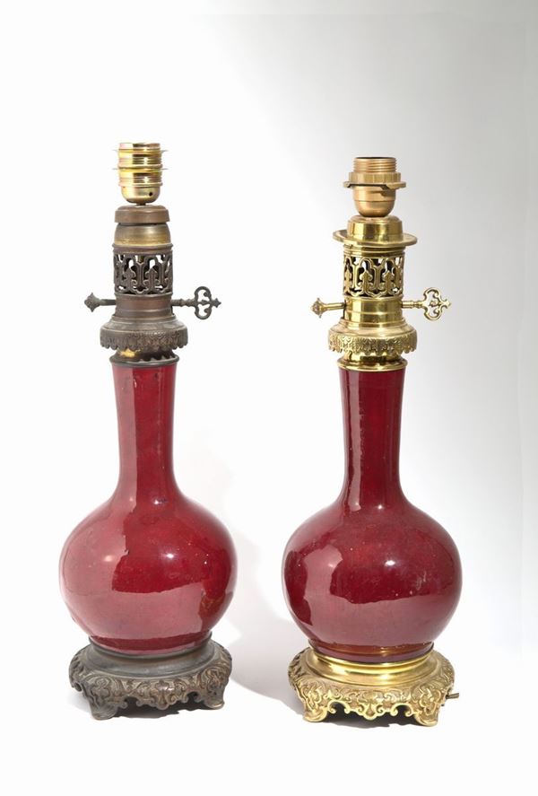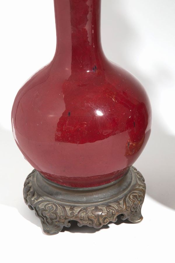 Pair of Sangue di ox porcelain vases mounted as a lamp. Bronze base. China.