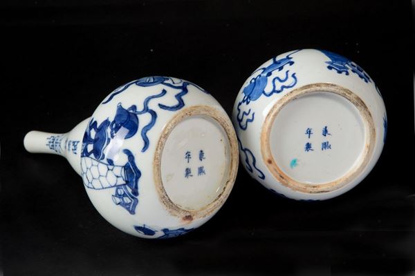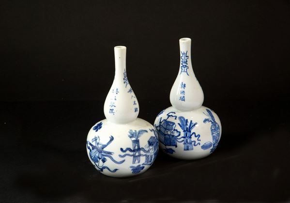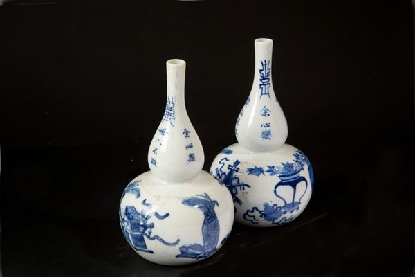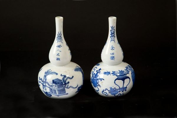 Pair of blue and white porcelain vases in the shape of a pumpkin depicting "VARIOUS OBJECTS AND WRITINGS". Brand on the bottom. China.