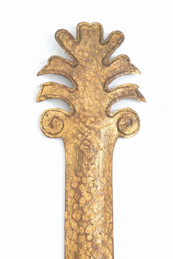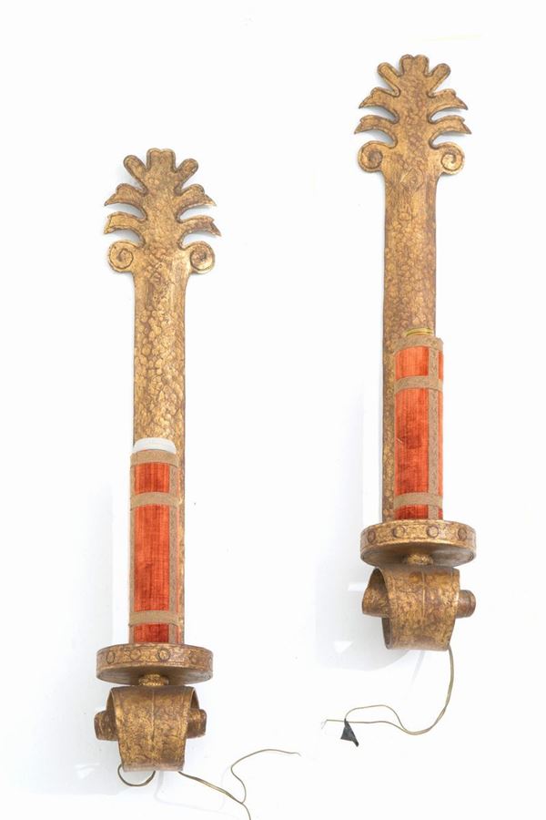 Pair of applique one light in embossed and gilded iron in the shape of palm leaves. Late 19th century.