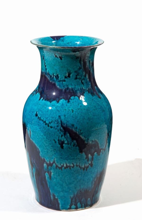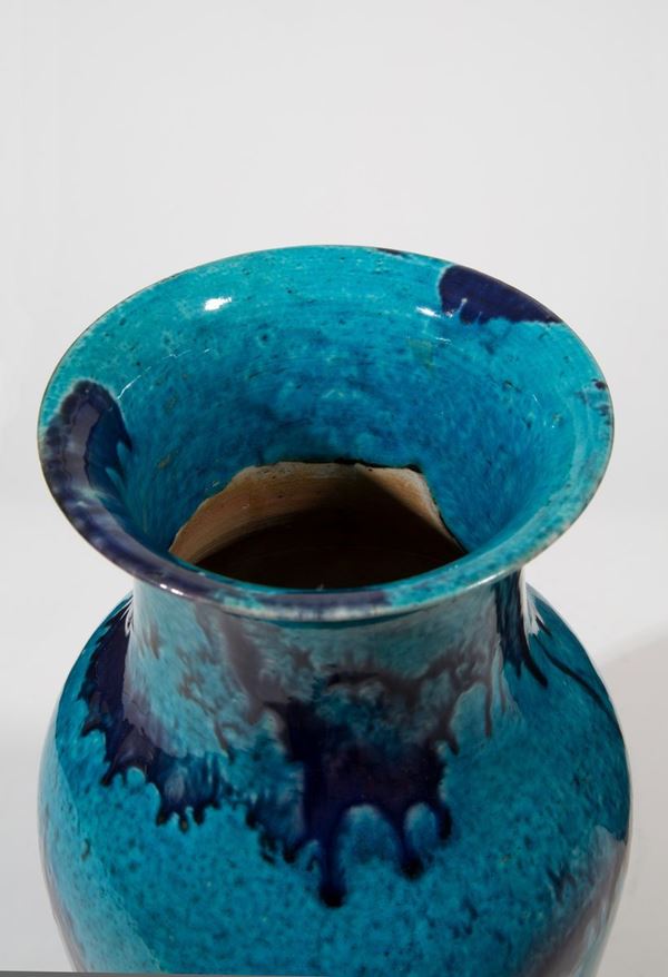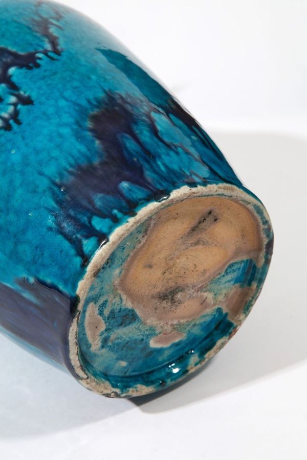 Blue porcelain vase with dragon in relief. Marked on the bottom. China.