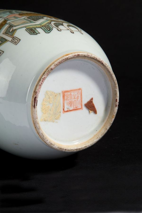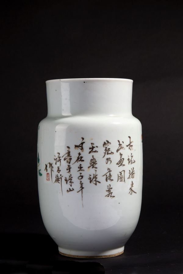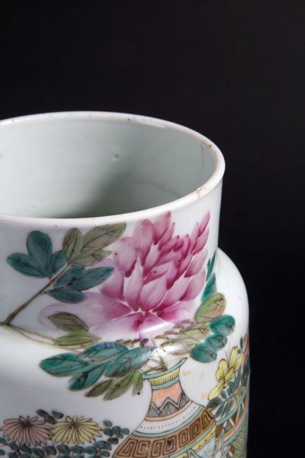 Porcelain vase with writings and decorations depicting "VASES AND FLOWERS". Brand on the bottom. China. Nineteenth century.