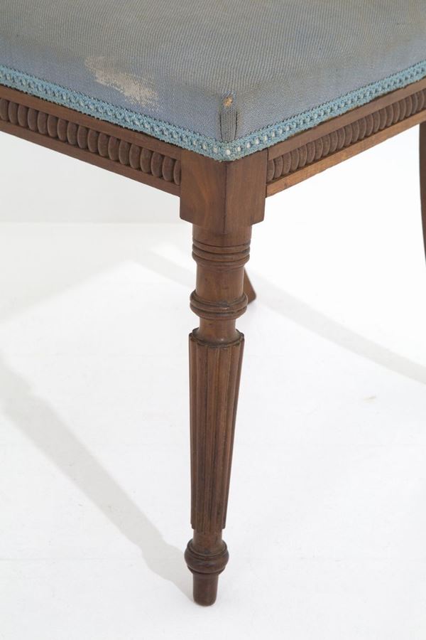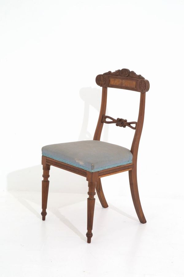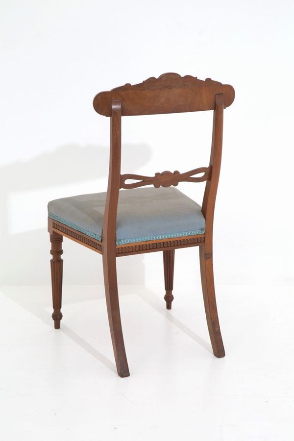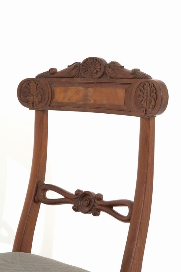 Six chairs in mahogany wood finely carved with floral and animal motifs with seats upholstered in blue cotton. PETERS workshop. Genoa. Nineteenth century.