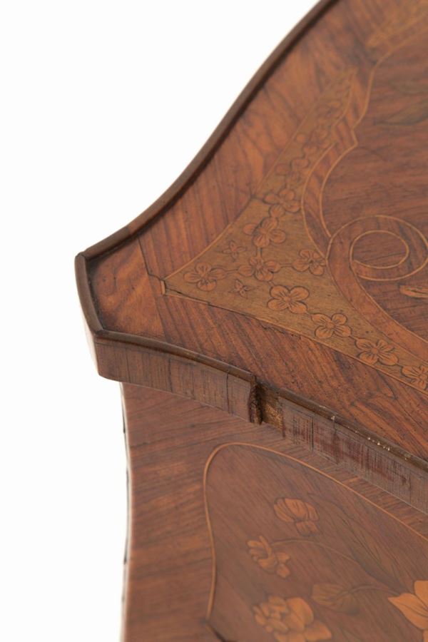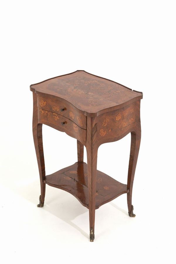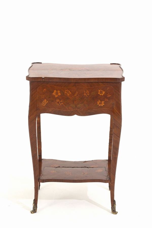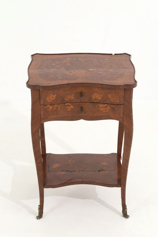 Coffee table with drawers in veneered wood and inlaid with floral motifs. France. Napoleon III period. Defects.