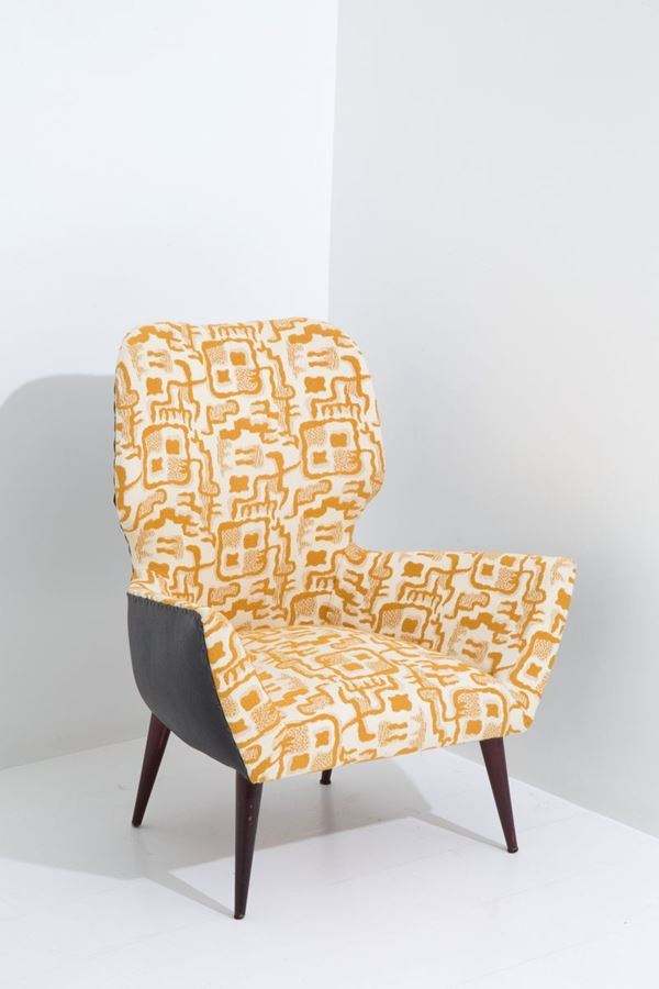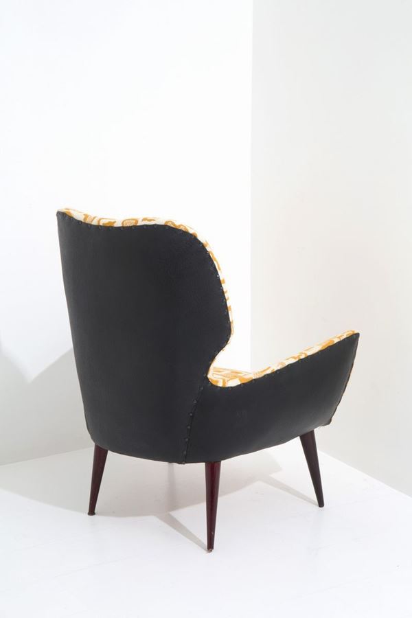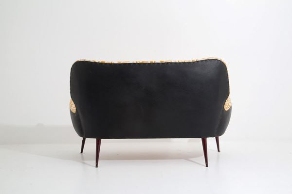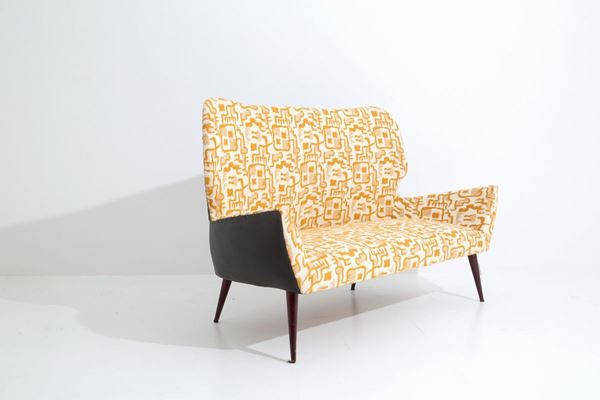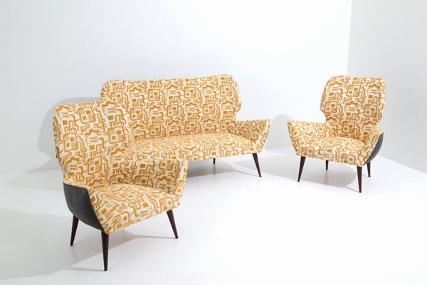 Small sofa and two armchairs in wood and fabric. Italian manufacture. 20th century. Reupholstered.