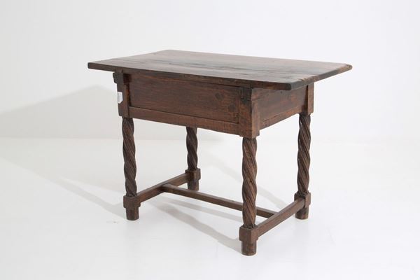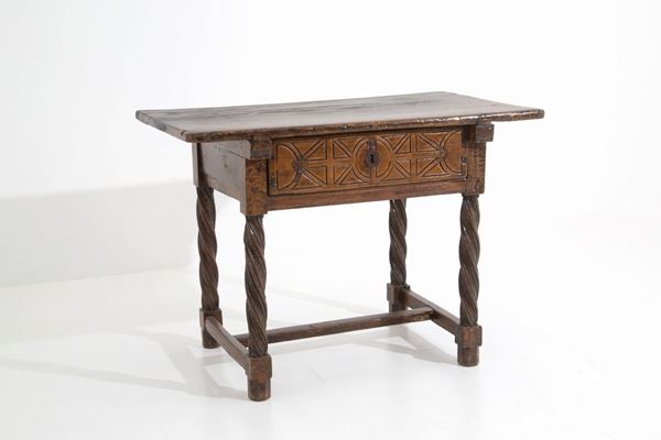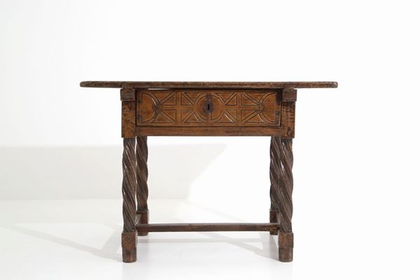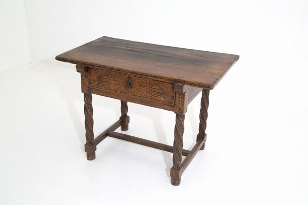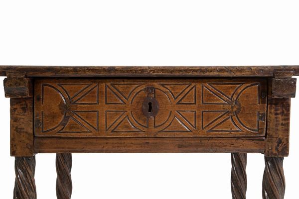 Wooden coffee table with turned legs joined by cross and drawer on the band. Spain. Second half of the 17th century.