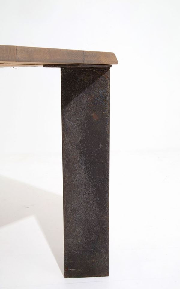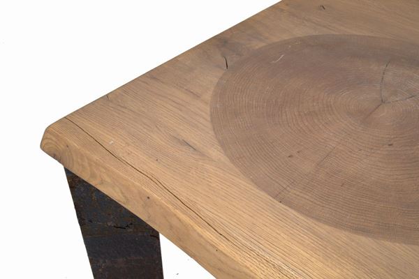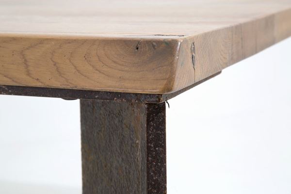 Square table with solid wood top, wrought iron legs. Italian manufacture. XX century.