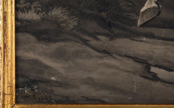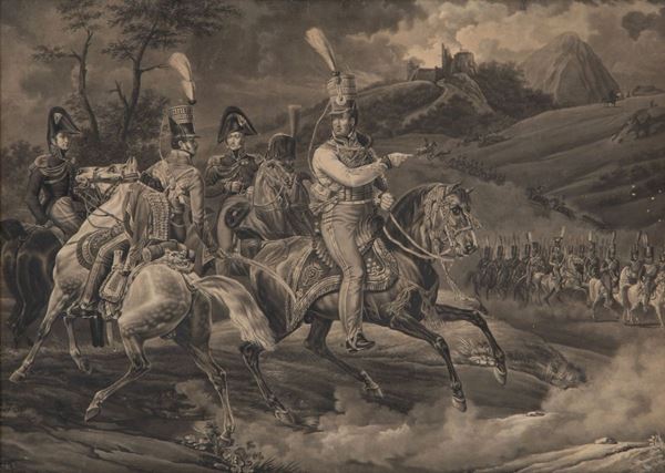 Tempera painting on paper depicting "THE DUKE D'ORLEANS, COLONEL-GENERALOF THE HUSSARS, IN BATTLE". Signed L. DAVID and dated 1809 lower left. In gilded frame.