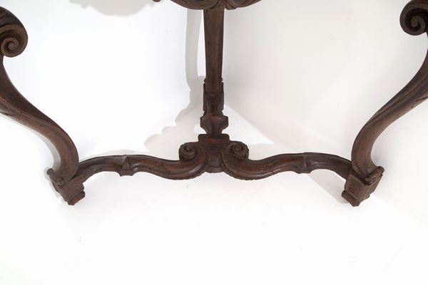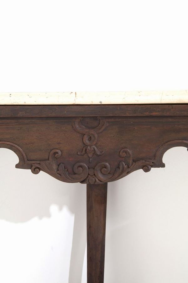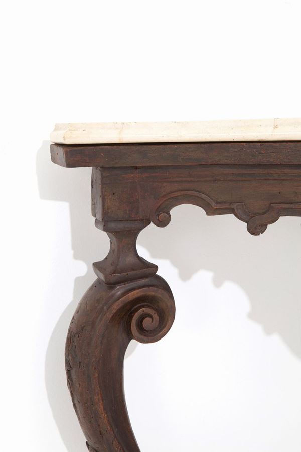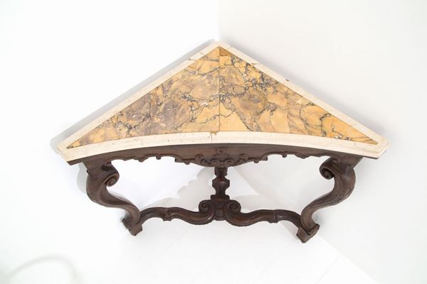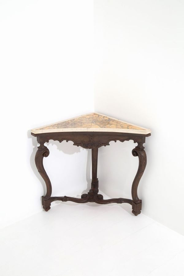 Corner console with three legs in carved walnut with marble top. Lombardy XVII century.