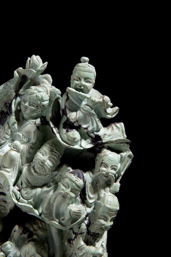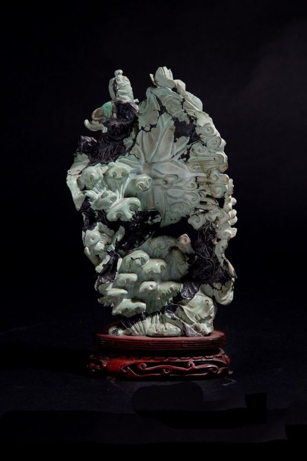 Turquoise sculpture depicting "LIFE SCENES". Wooden base. China.