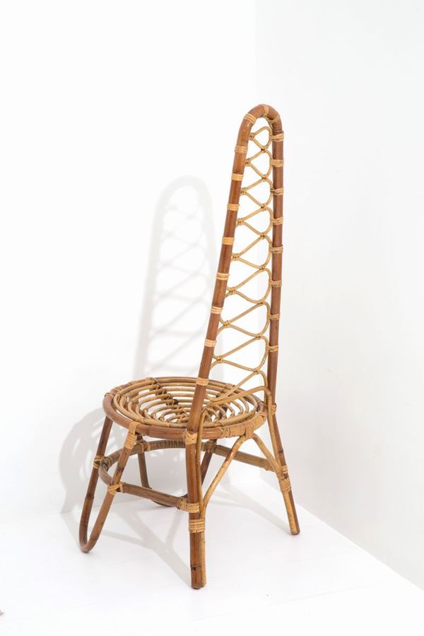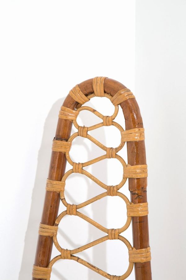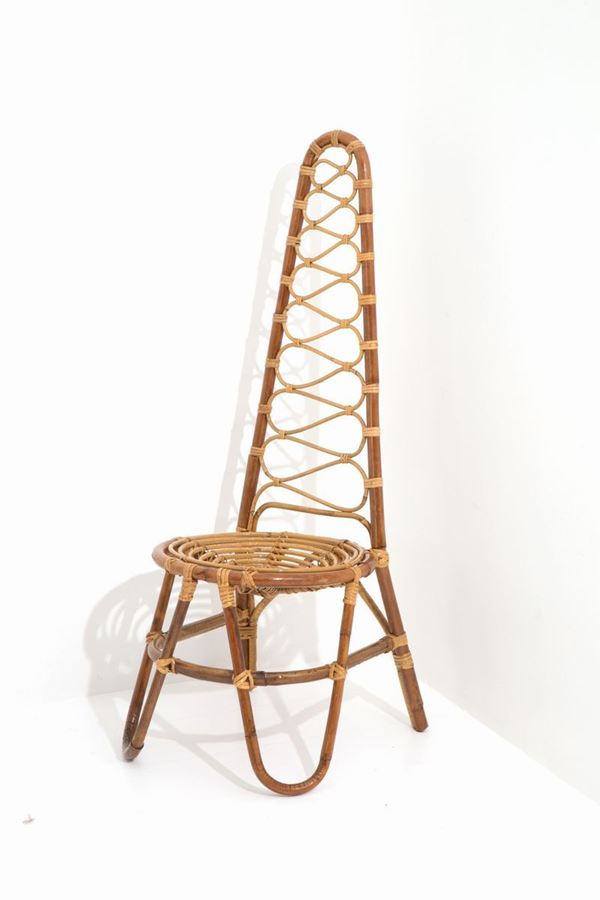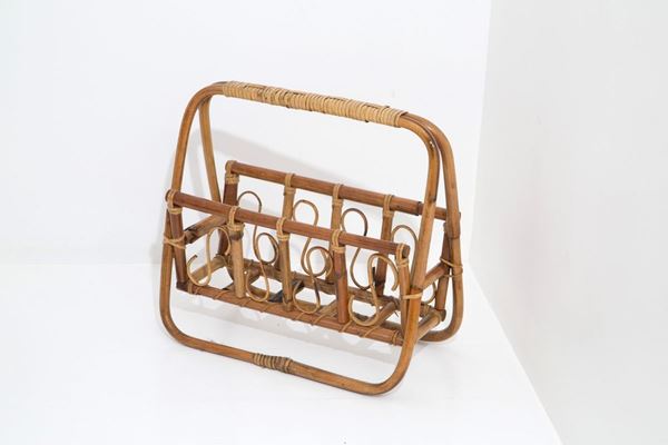 Pair of wicker armchairs and magazine racks. 1950s-1960s