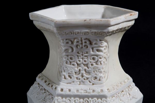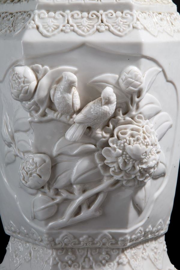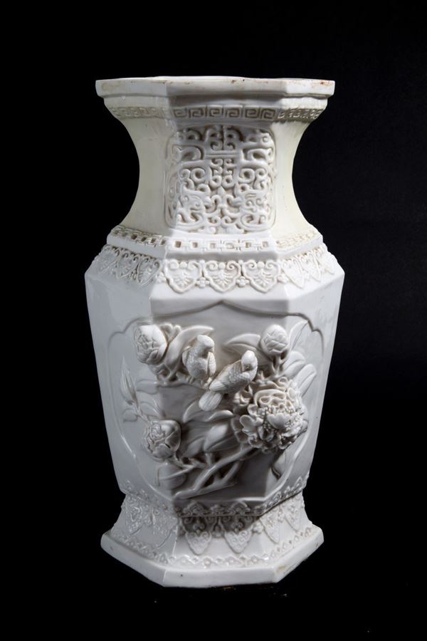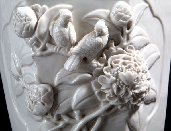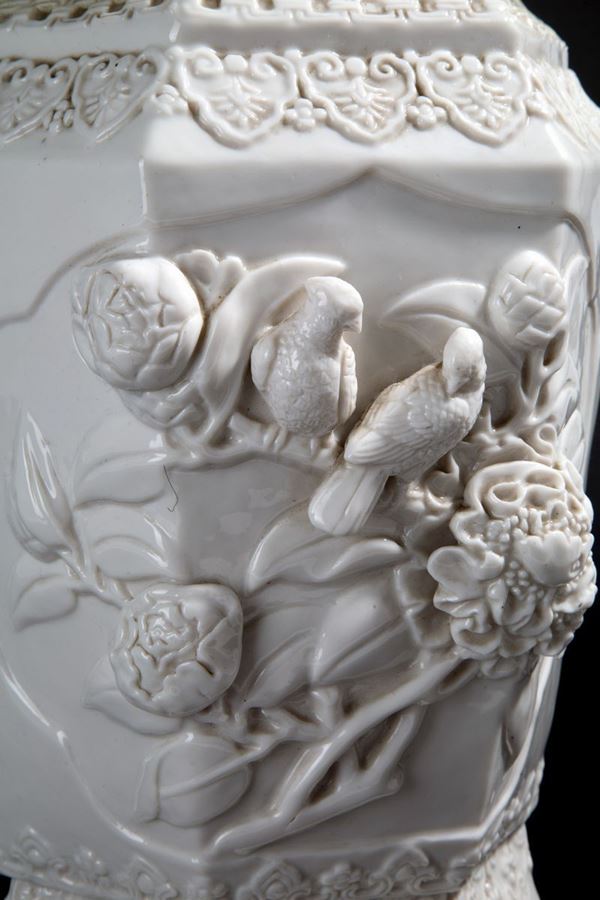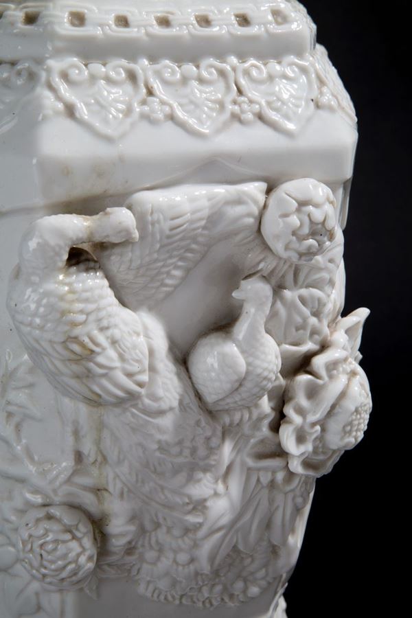 Vase in high relief white porcelain. China. Late 19th century. Defects and restorations.