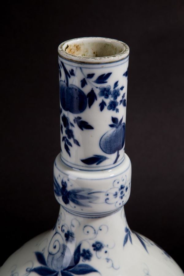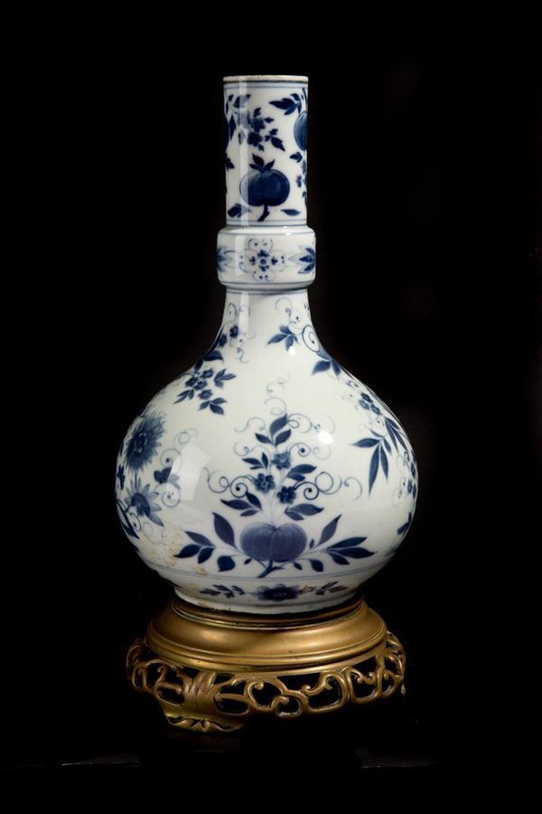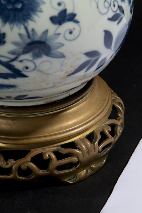 White and blue ceramic vase with floral motifs. Bronze base. China. Defects.