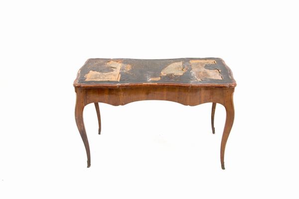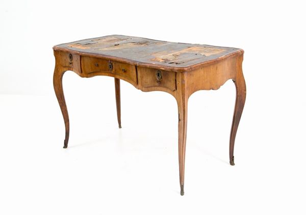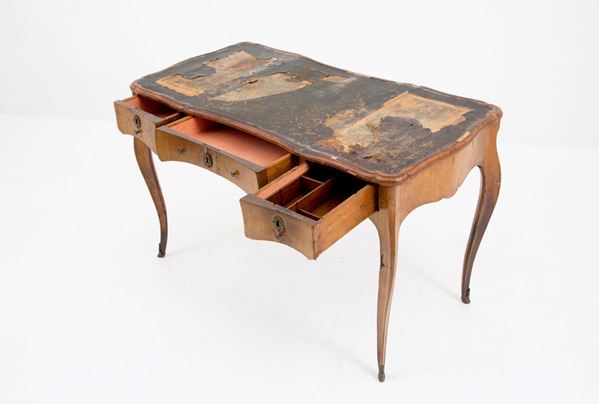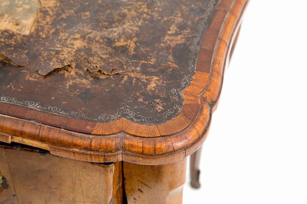 Desk in textured and shaped wood, veneered in walnut with bronze finishes and leather top. Liguria. XVIII century. Defects and shortcomings.