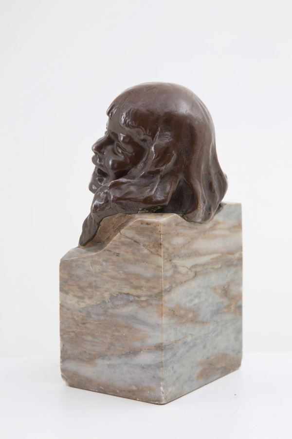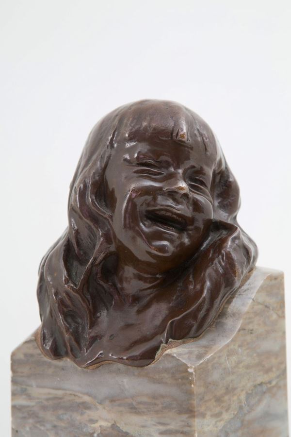 Patinated bronze sculpture depicting "HEAD OF A LAUGHING CHILD". Marble base. Early 20th century.