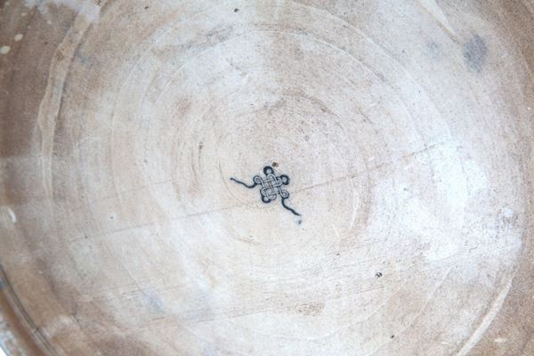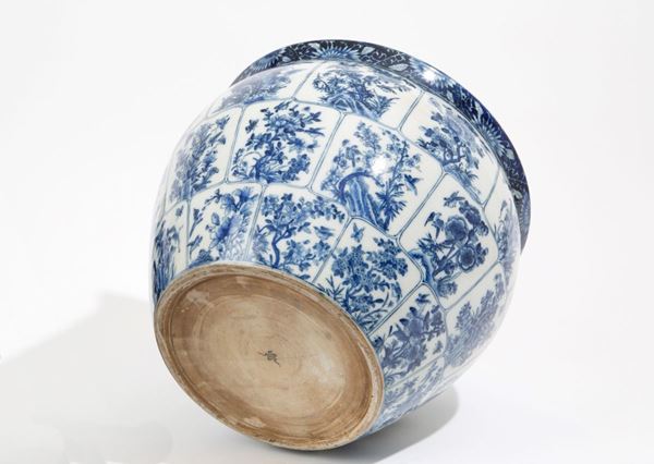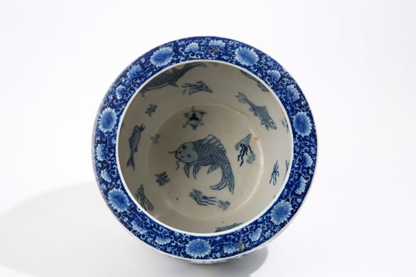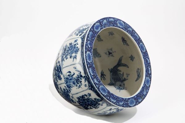 Cachepot in white and blue porcelain with floral reserves and fish inside. China. 19th century.