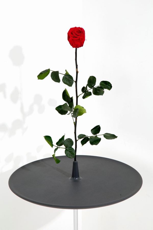 Celine service table with chromed steel base and pink up stem in the center of the removable polyurethane top-tray. BALERI ITALIA production. 1997.