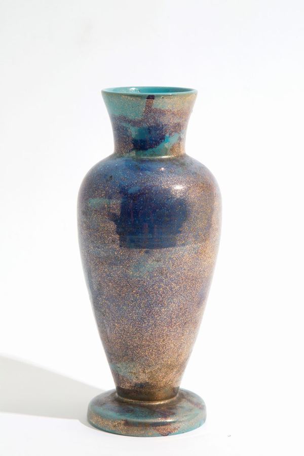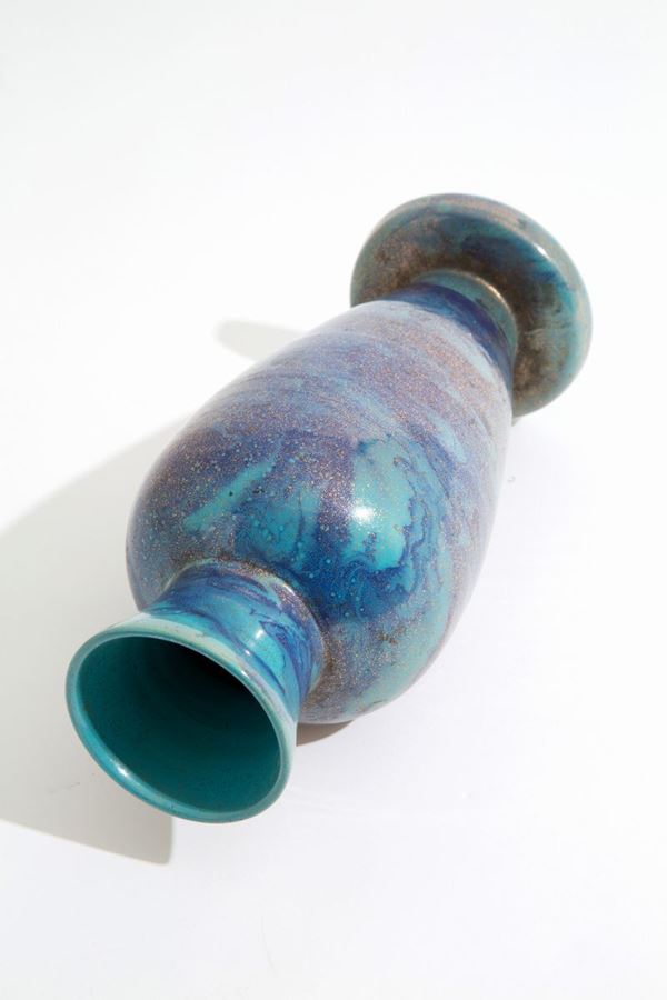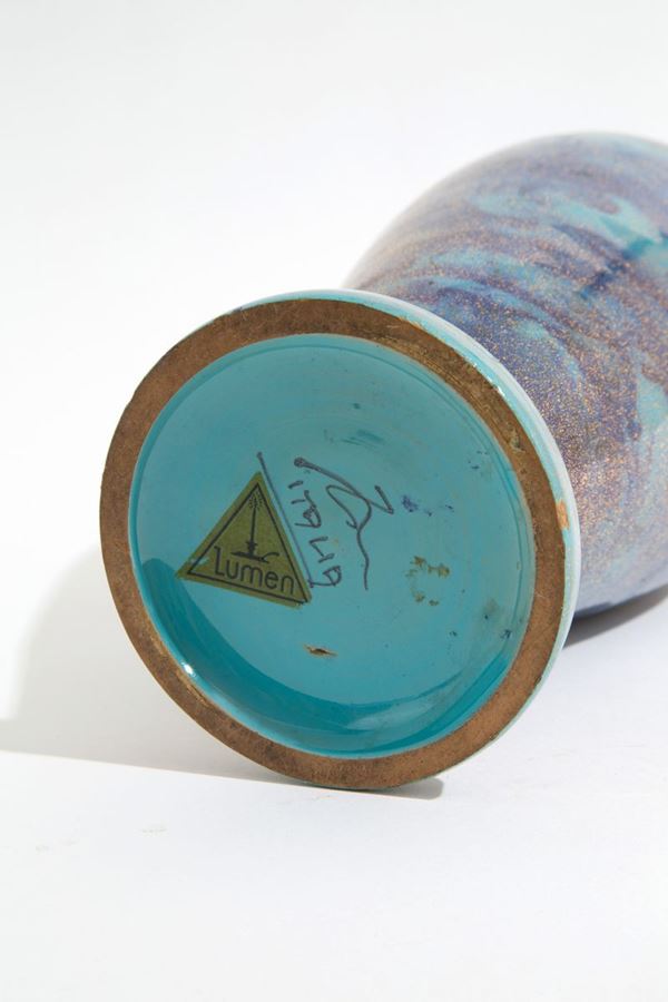 Blue glazed ceramic vase with blue and gold shades. ZACCAGNINI manufacture. Marked Lumen on the bottom.