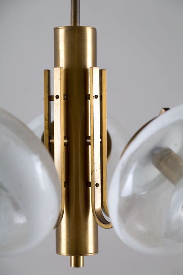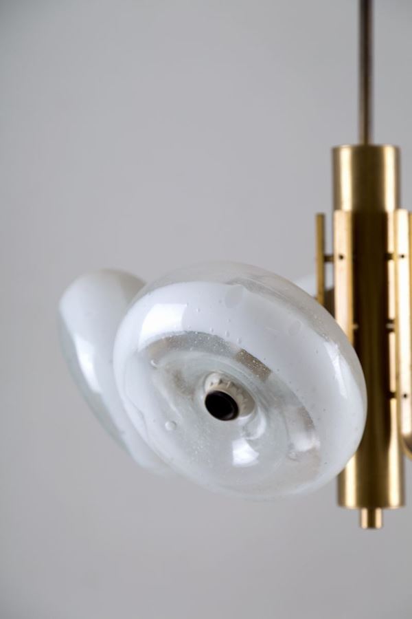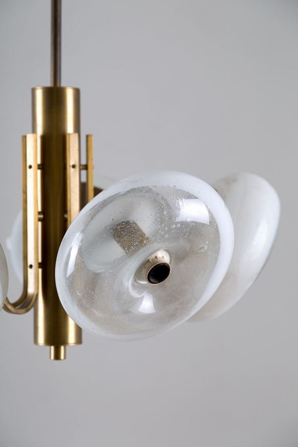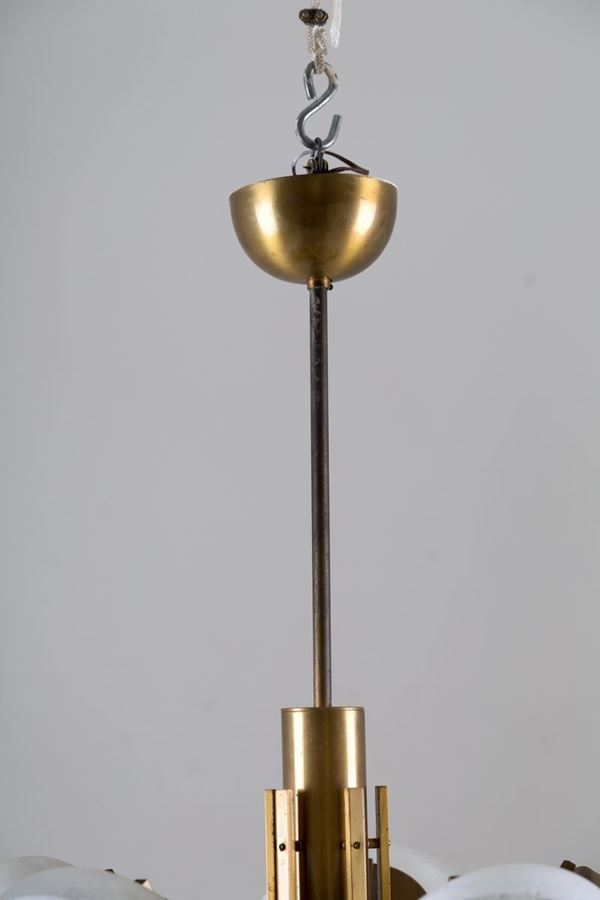 Five lights chandelier in brass and milky glass. Italian manufacture. 70's.