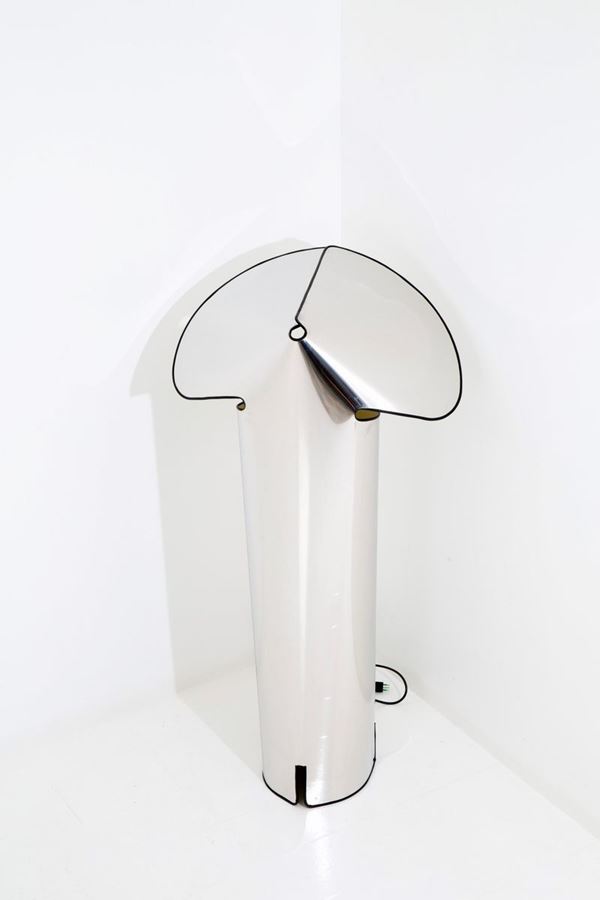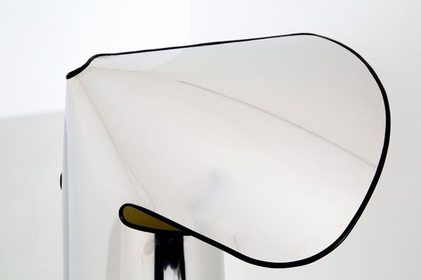 Chiara floor lamp made with a single flexible steel sheet with mirror finish on the outside and opaque white inside and black rubber profile. FLOS production. 70's.