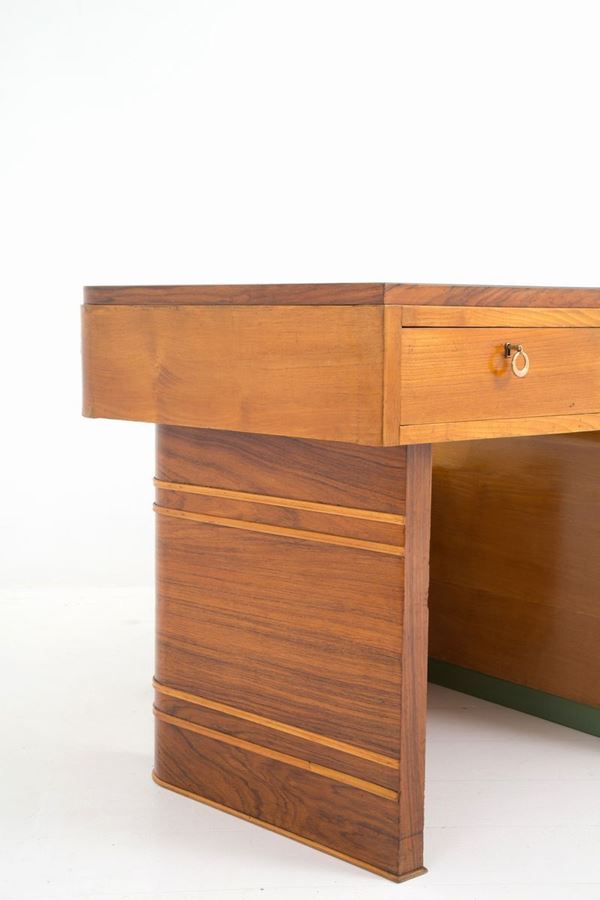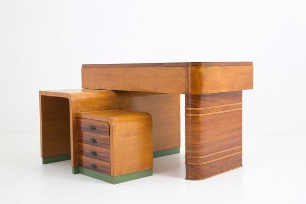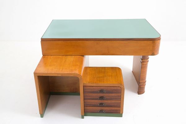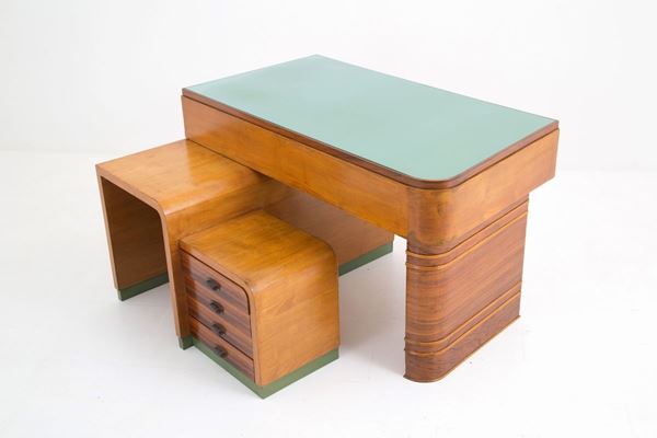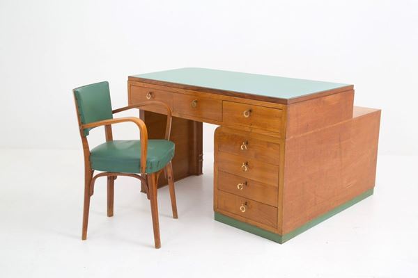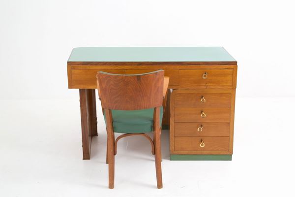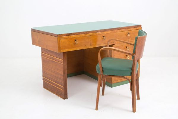Designer desk in oak and walnut, with chair in sky and beech. 40s. Vintage glass with wear scratches.