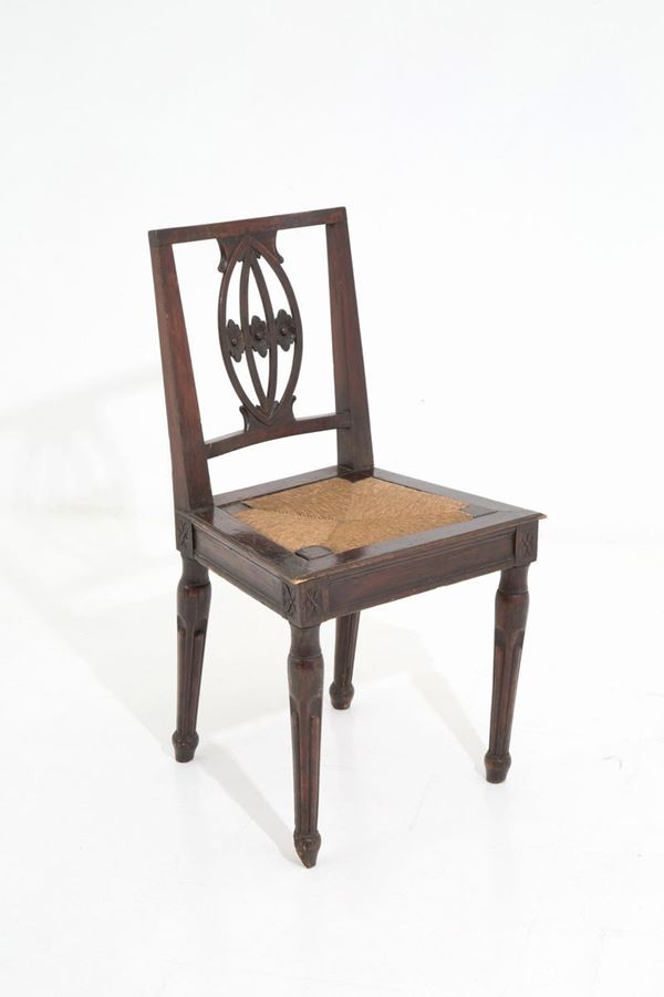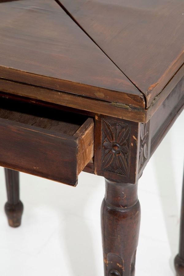 Walnut game table with opening top, drawer on the band and four chairs with perforated folder with floral motifs. Louis XVI period.