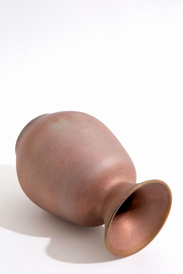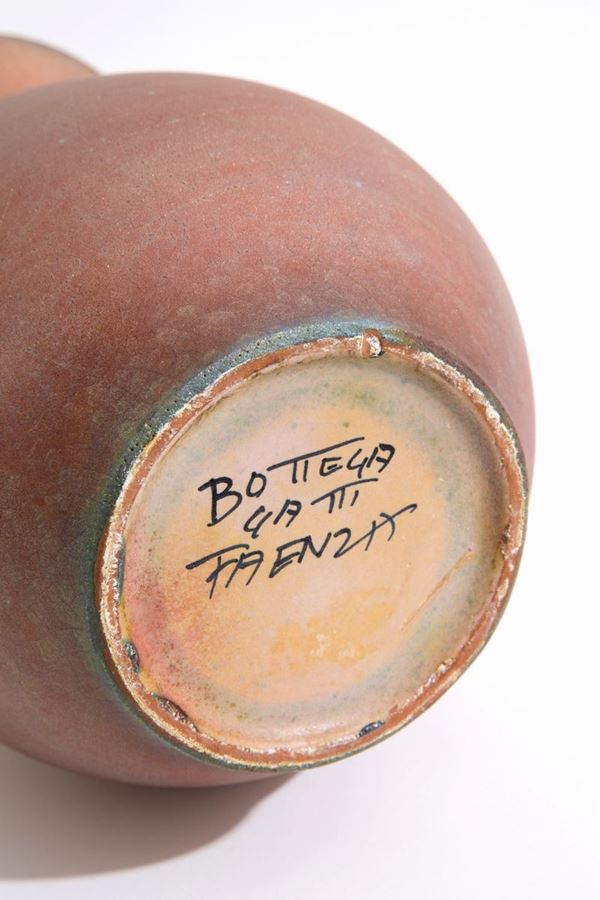 Pink copper and pulverized gold ceramic vase. Signed Bottega Gatti Faenza and dated 1930/40 on the base.