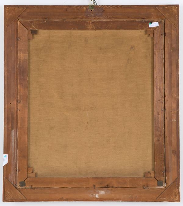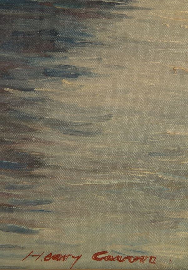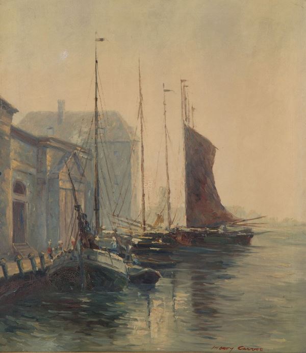 Oil painting on canvas depicting "BOATS ON THE SHORE". Late 19th-early 20th century. Unidentified signature lower right. In carved and gilded frame. Defects.